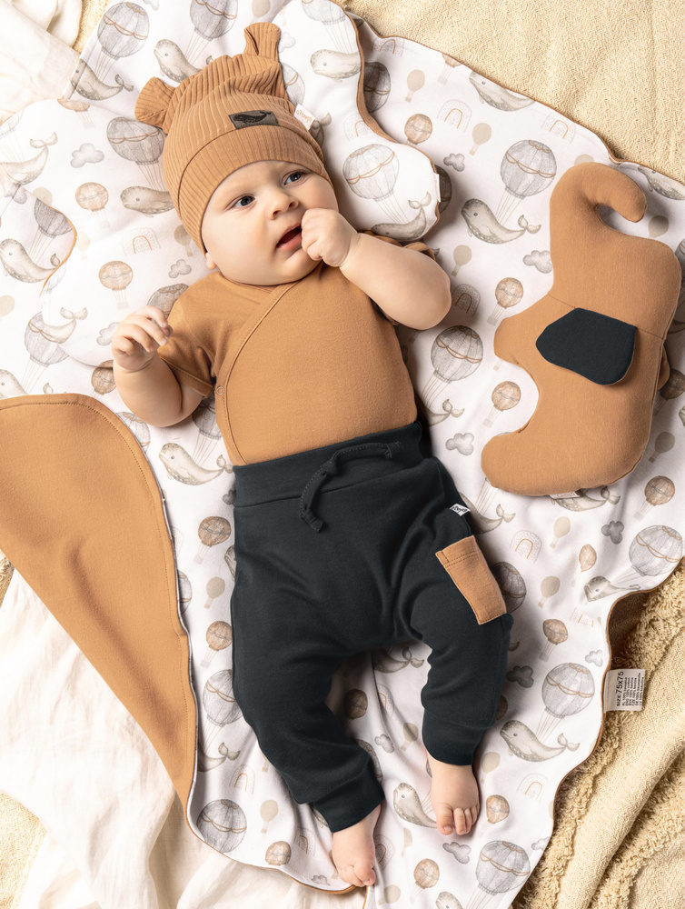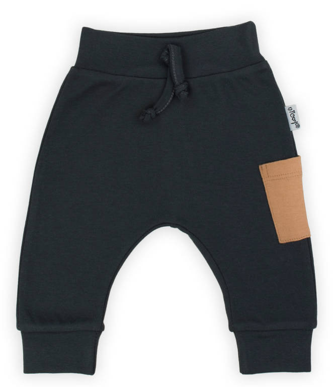 Wygodne, grafitowe spodnie dla chłopca ze 100% bawełny. Materiał jest całkowicie bezpieczny dla skóry dziecka. Pas i mankiety w nogawkach wykończone zostały ściągaczem pod kolor spodni. W fasonie tym wszyto gumkę do pasa od rozmiaru 68. Na lewym boku naszyto ozdobną kieszonkę w kolorze karmelowym. Całość dopełnia sznureczek doszyty w pasie.