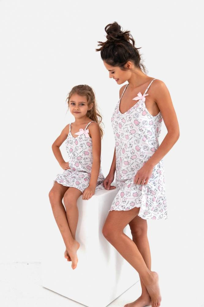 Urocza koszula dziewczęca wykonana z wysokiej jakości bawełny. Koszulka na cienkich ramiączkach ozdobiona wzorem w owieczki.