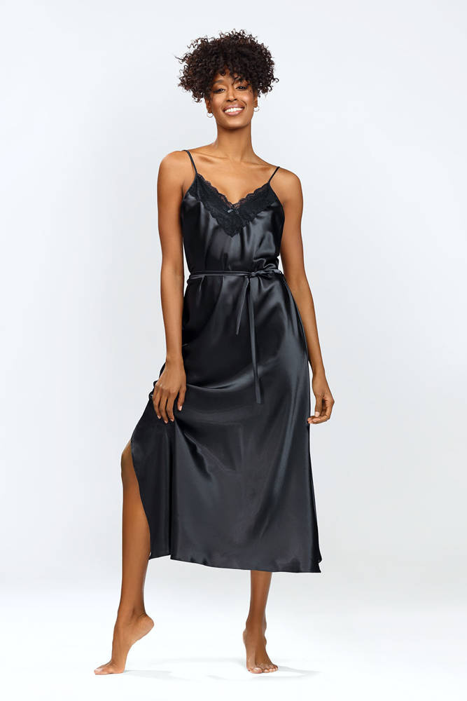 Gustowna koszulka nocna wykonana z zwiewnej, delikatnej dla ciała satyny. Przód halki tworzy delikatny trójkątny dekolt. Delikatny satynowy pasek pozwala dopasować krój do naszych kształtów. Koronkowe wykończenie nadaje jej seksowności i zmysłowości. Halka ma dwa mocne wycięcia po bokach.