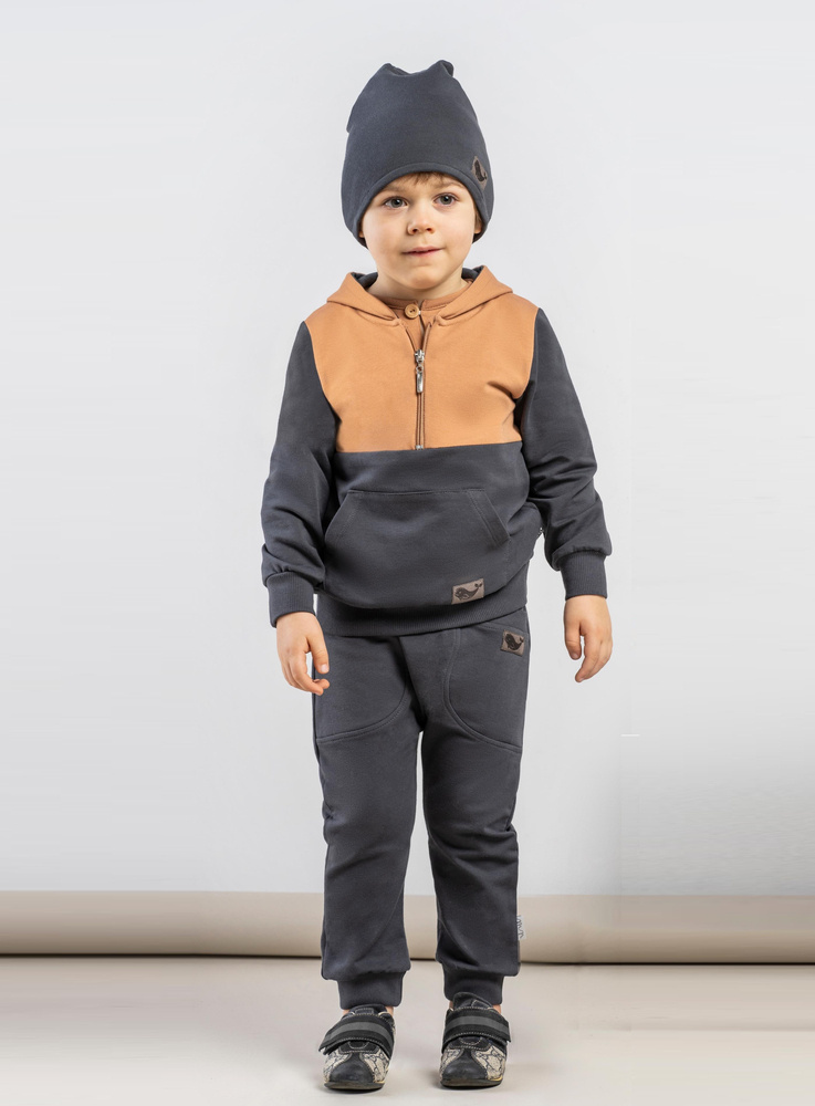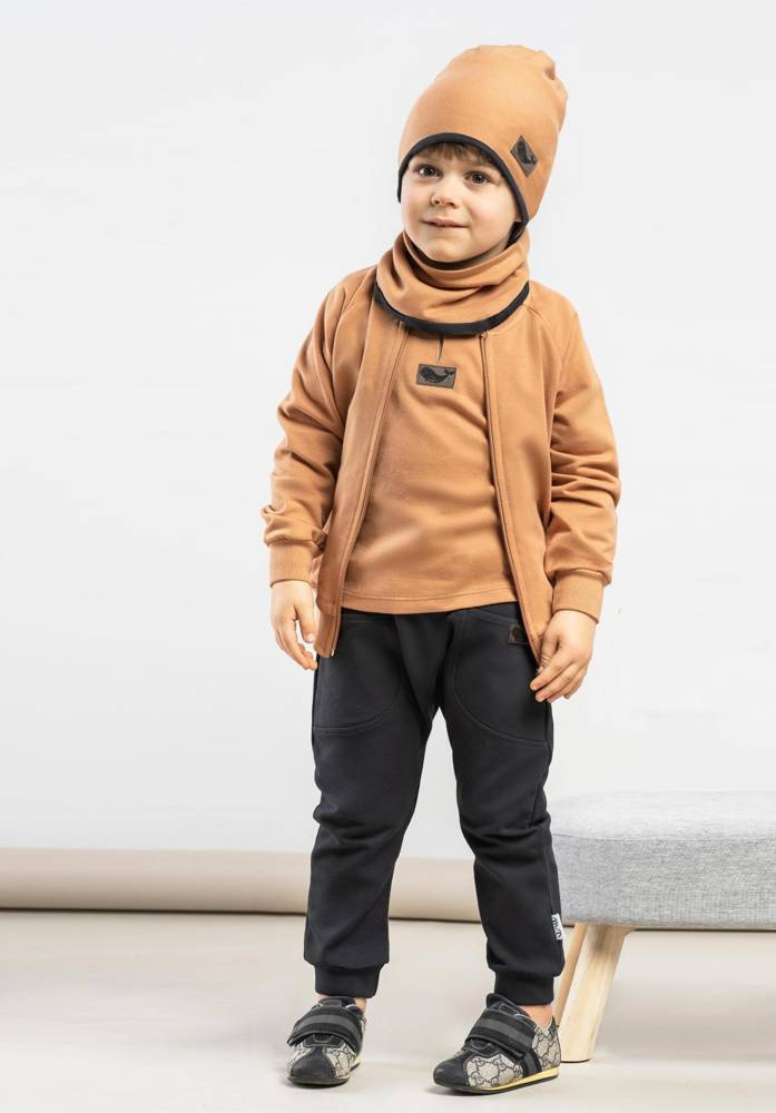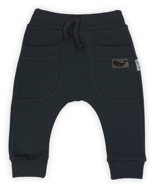 Spodnie uszyte z bawełny dresowej z domieszką elastanu, co powoduje, że materiał nie odkształca się, a zarazem jest miły w dotyku. W pasie posiadają wygodną gumkę nie uciskającą brzuszka. Ubranko charakteryzuje wygodny fason, nogawki zostały zakończone ściągaczami pod kolor spodenek.