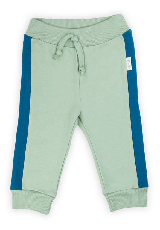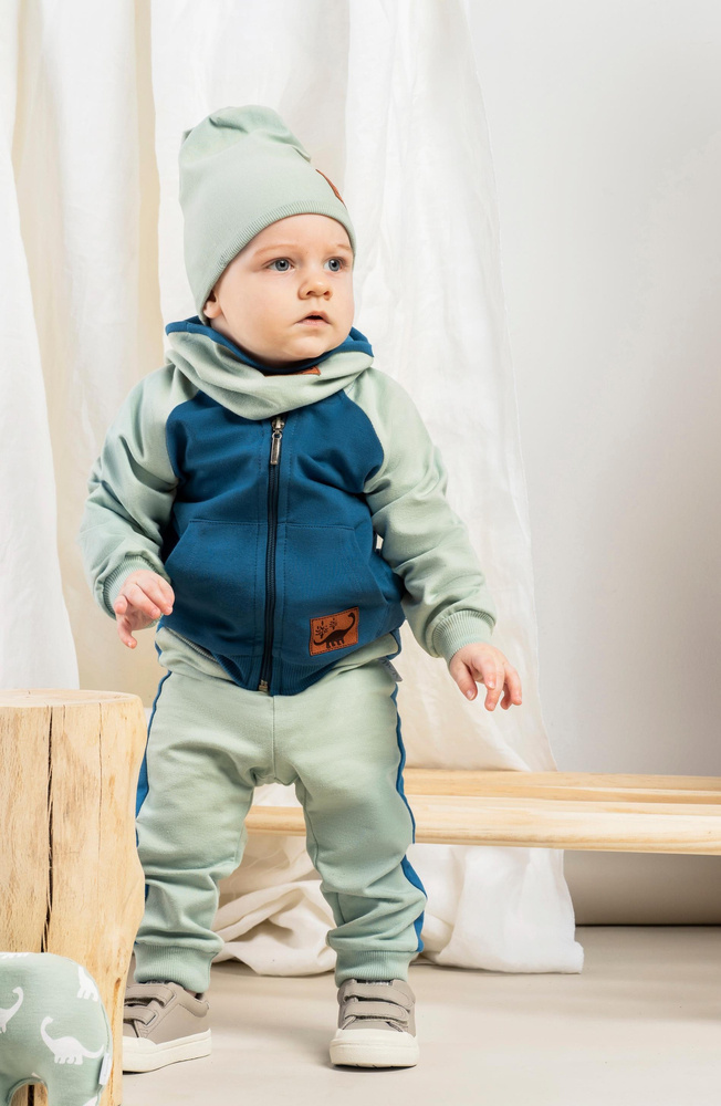 Spodnie uszyte z bawełny dresowej z domieszką elastanu, co powoduje, że materiał nie odkształca się, a zarazem jest miły w dotyku. W pasie posiadają wygodną gumkę nie uciskającą brzuszka. Ubranko charakteryzuje wygodny fason, nogawki zostały zakończone ściągaczami pod kolor spodenek.