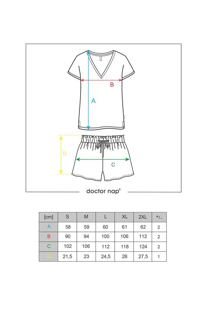 Dwuczęściowa piżamka firmy Doctor Nap wykonana z wysokogatunkowej bawełny. Idealna na dobry sen i na wspaniały początek dnia przy pierwszej porannej kawie. Luźna bluza z krótkim rękawem, nie krępuje ruchów i ładnie podkreśla sylwetkę. Dekolt typu V, bluzka jednolita. Spodnie krótkie, wzorzyste, w pasie wykończone gumką. Przyjemna w dotyku piżama, utrzymana jest w ciekawej kolorystyce.