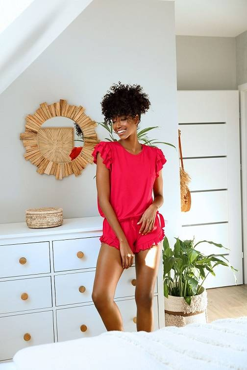 Komplet Lulu to bardzo romantyczna piżamka, która nada się na codzienną stylizację po domu. Dostępny w trzech kolorach: czerwonym, ecru-granatowym i ecru. Komplet składa się z krótkich spodenek wykończonych falbanką oraz krótkiej bluzeczki również wykończonej falbankami na rękawkach. Zarówno spodenki, jak i bluzeczka posiadają ściągacz wykończony satynową kokardą, dzięki czemu dopasujesz piżamkę idealnie do swojej figury.