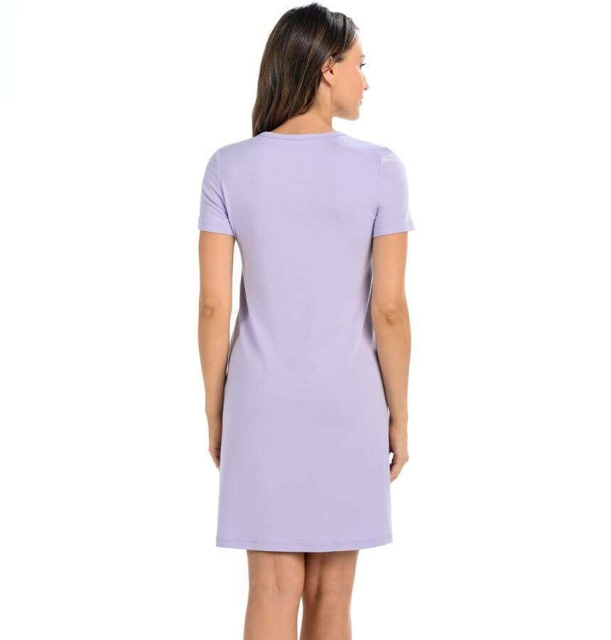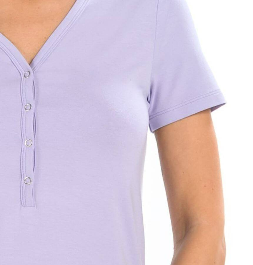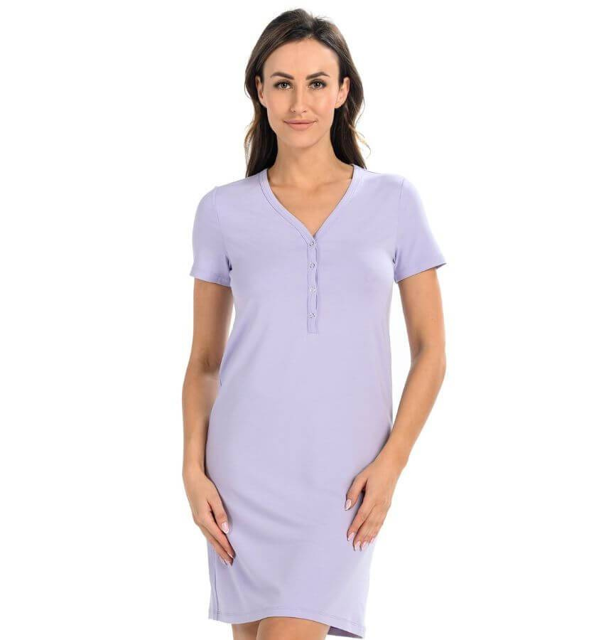 Damska koszula nocna do karmienia wykonana z delikatnej i miłej w dotyku wiskozy, która chłodzi ciało. Dodatek elastycznej nici lycry gwarantuje dłuższe użytkowanie i idealne dopasowanie do sylwetki. Koszula damska jest w pięknym i twarzowym kolorze lawendy. Posiada krótki rękawek. Na przodzie zapinana jest na delikatne haftki niewielkich rozmiarów, co ułatwia komfortowe użytkowanie przy karmieniu dziecka. Rozpinana koszula na dekolcie jest alternatywą dla koszul karmiących. Długością, koszula sięga przed kolano, delikatnie przylega do sylwetki. Posiada prosty klasyczny fason. Nie powinno jej zabraknąć w garderobie każdej kobiety.