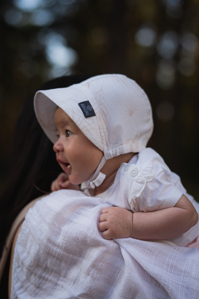 Miękka, bambusowa bonetka z szerokim daszkiem, która świetnie chroni główkę przed wiatrem i promieniami słońca. Z przodu ma daszek, który dodatkowo chroni buźkę przed promieniami słonecznymi. W dolnej części troczek do regulacji rozmiaru, dla lepszego dopasowania do główki dziecka.