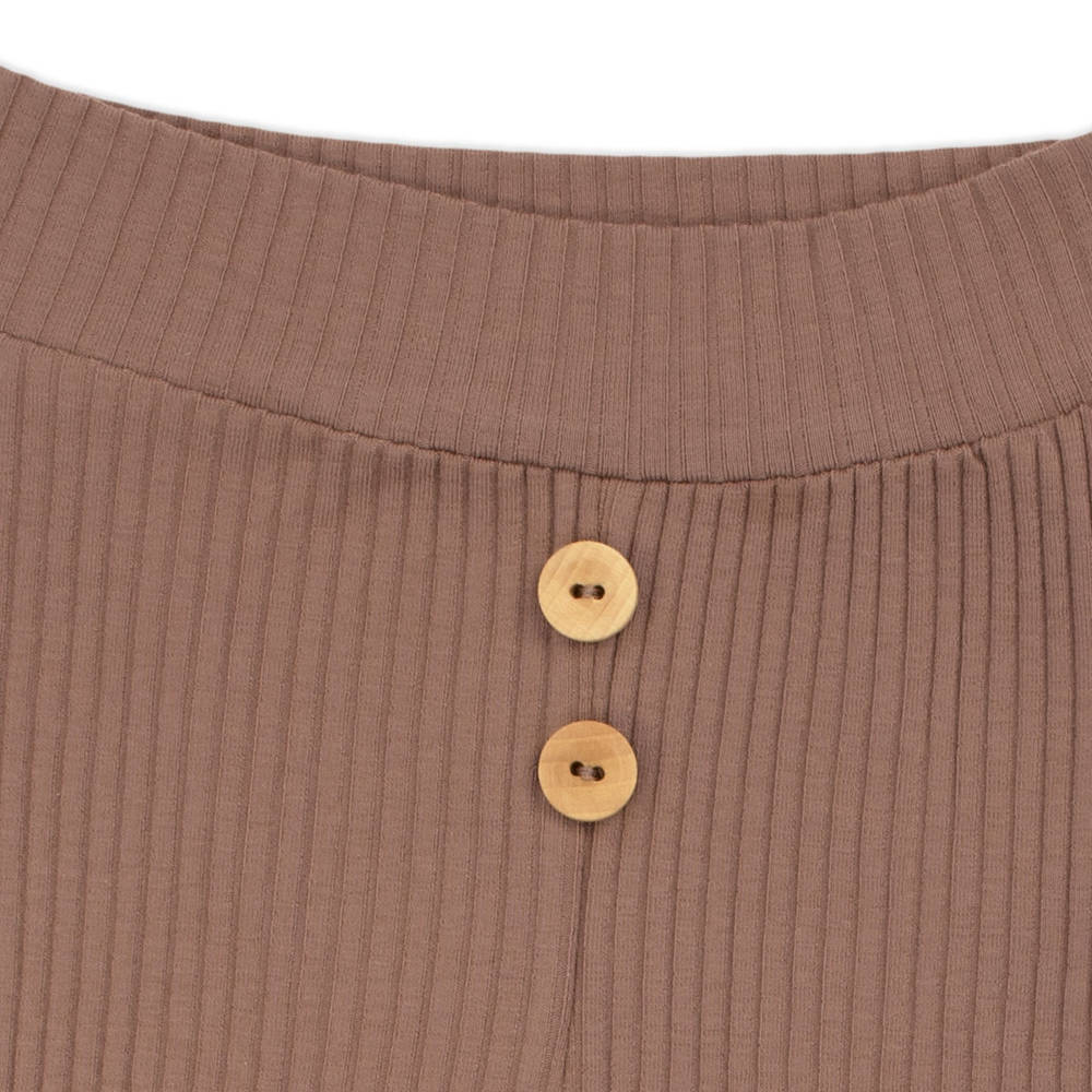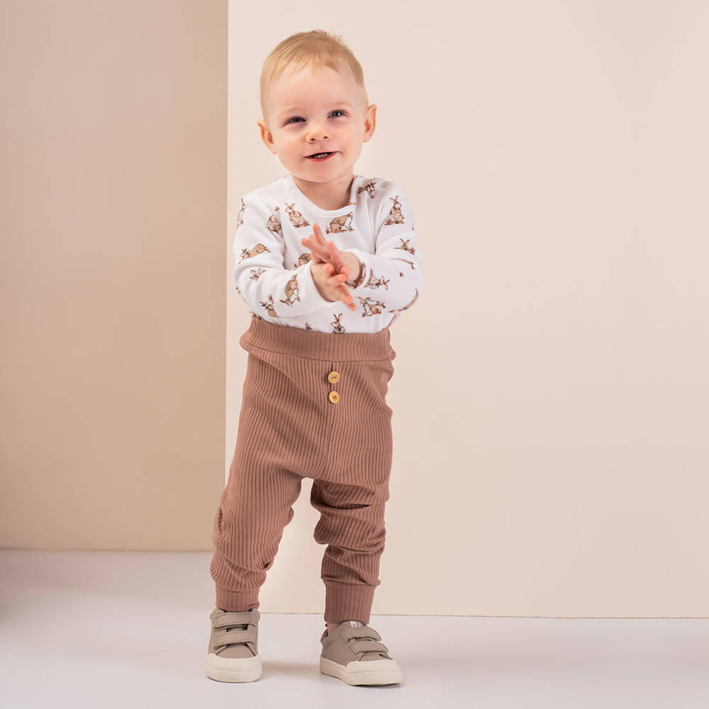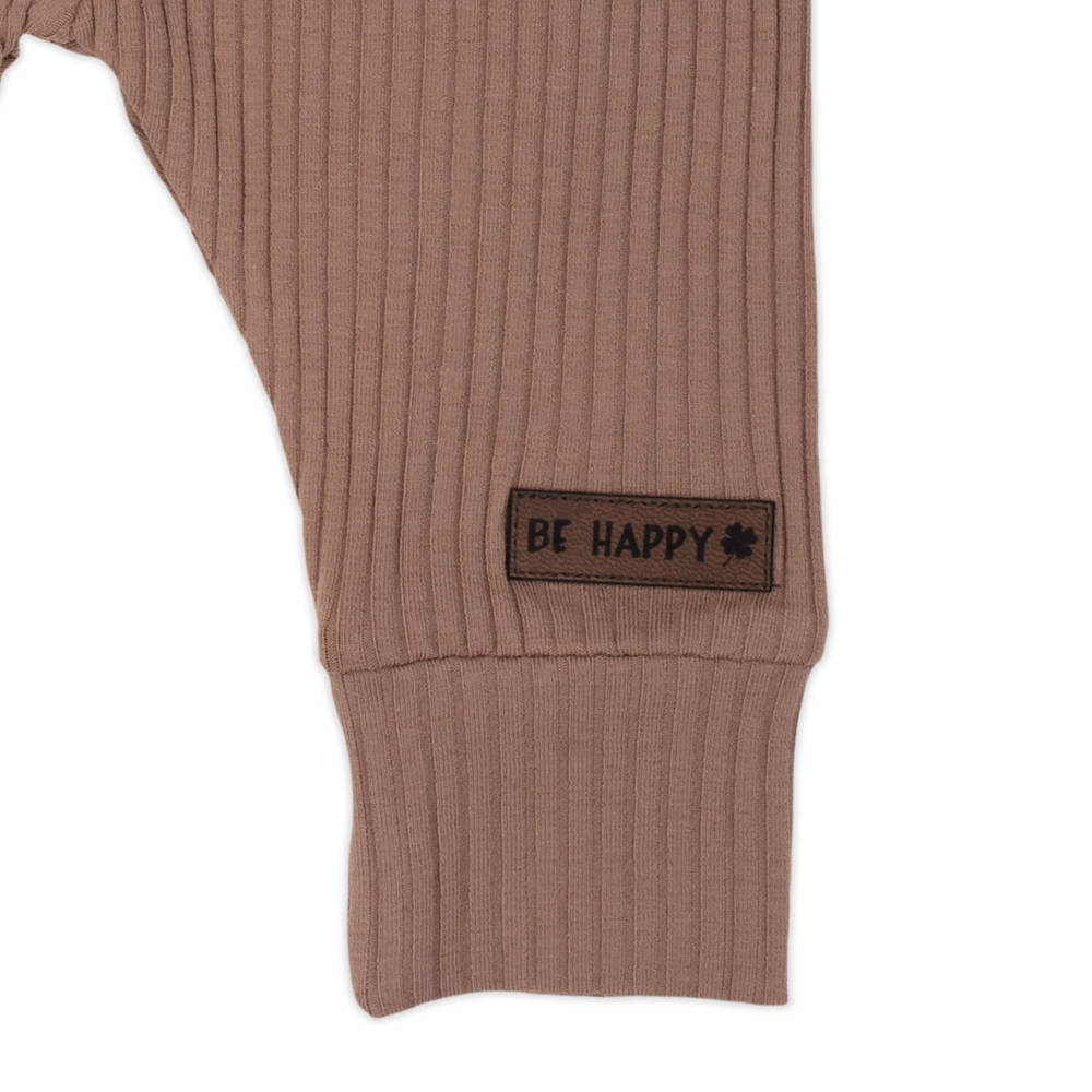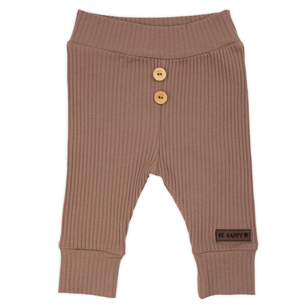 Modne spodnie dla chłopca z brązowej ,prążkowanej bawełny z niewielką ilością elastanu. Materiał jest całkowicie bezpieczny dla skóry dziecka. Pas i mankiety w nogawkach wykończone zostały z tego samego materiału. Spodnie posiadają gumkę w pasie od rozmiaru 68. Przód zdobią naszyte dwa drewniane guziczki oraz naszywka "BE HAPPY".