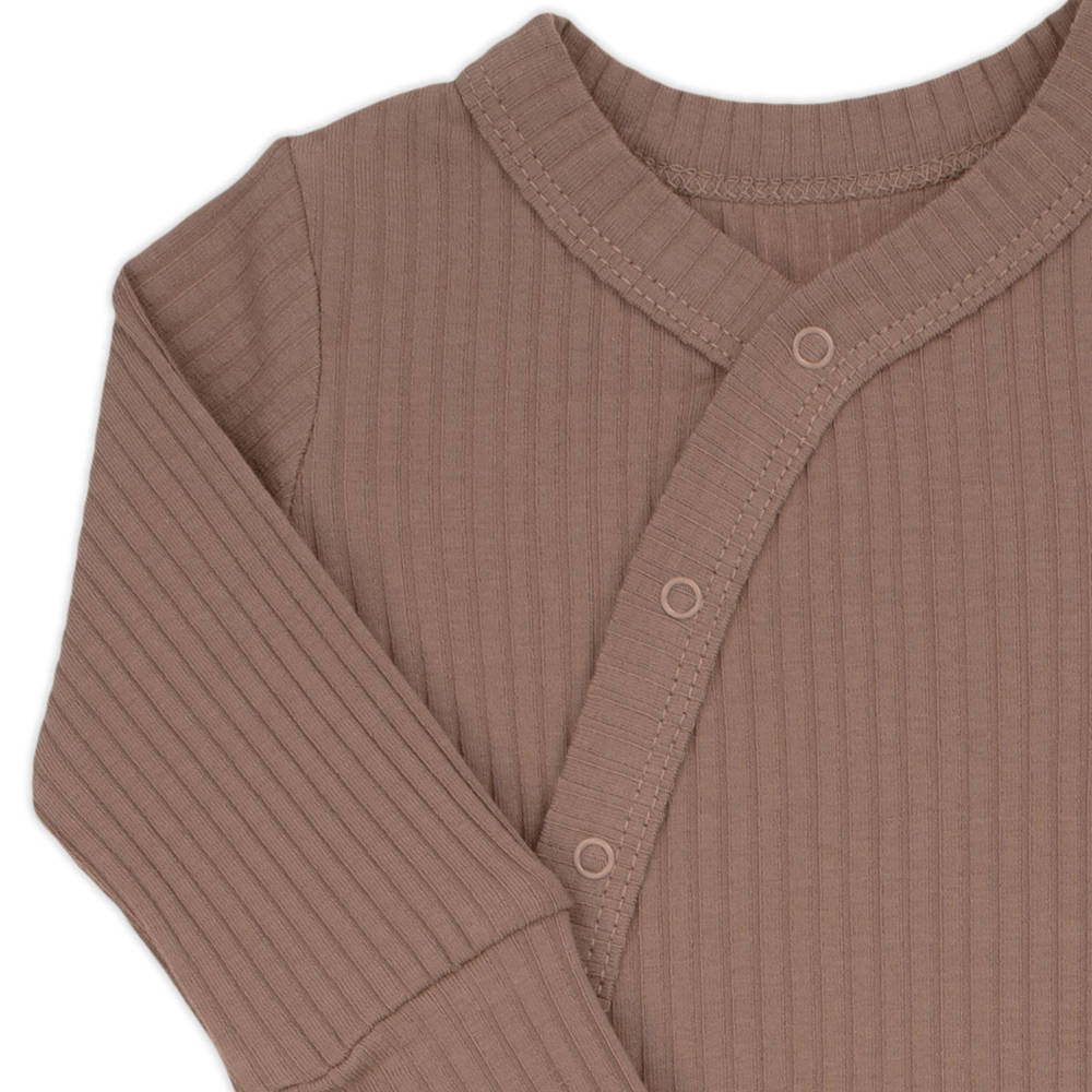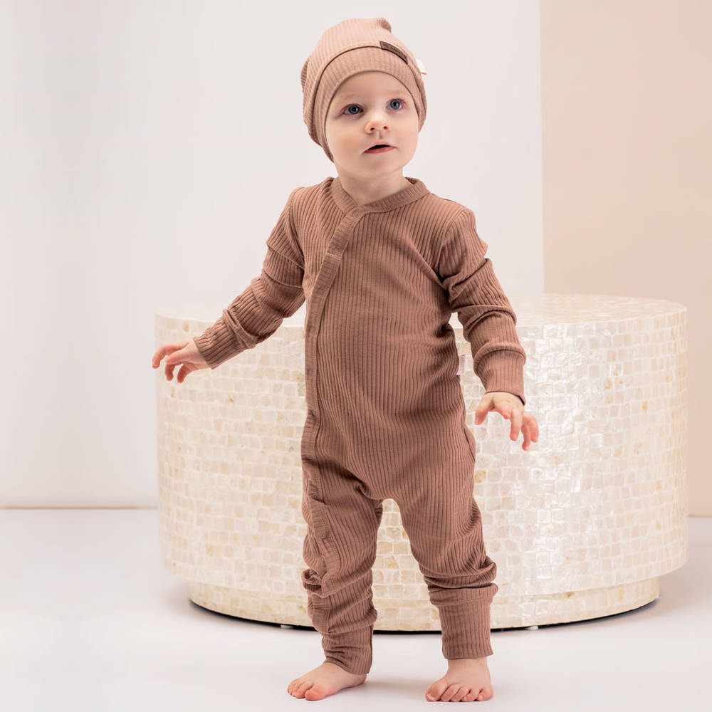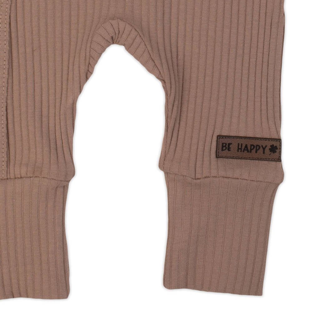 Brązowy pajacyk dla chłopca wykonany z prążkowanej bawełny z niewielką ilością elastanu. Zdecydowanie must have każdego rodzica. Zapinany na jedną stronę, na bezniklowe napy. Nogawki wykończone mankietami. Ozdobiony dodatkowo naszywką "BE HAPPY". Uszyty z materiału posiadającego certyfikat Oeko-Tex Standard 100 Tekstylia godne zaufania. Fason jest luźny i wygodny, idealnie sprawdzi się jako jedno z pierwszych ubranek maluszka.