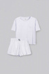 Urocza piżama damska uszyta z miękkiej i przyjemnej dla ciała bawełny. Model z oversizową, wygodną koszulką oraz krótkimi spodenkami podkreślającymi nogi. Spodenki mają nieco wyższy stan oraz szeroką gumę w pasie. Wykonana z niezwykle delikatnej i przewiewnej bawełny, zapewniającej komfort podczas snu.