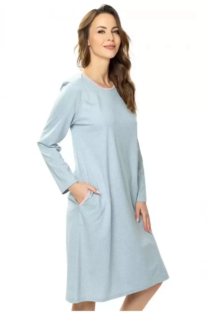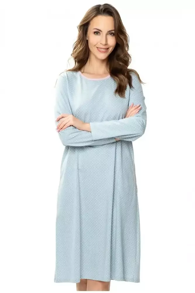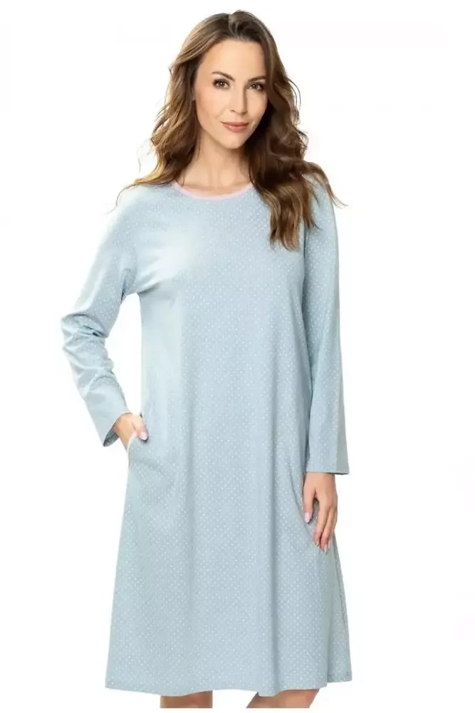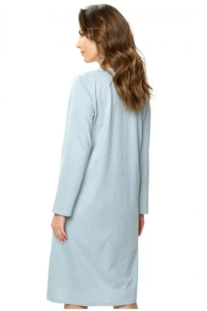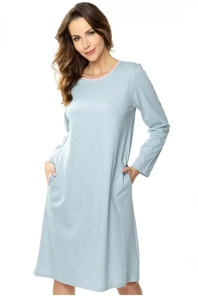 Koszula została uszyta z najwyższej jakość polskiej bawełny . Nawet po wielu praniach nie traci swojej miękkości ani gramatury. Posiada praktyczne, zakamuflowane kieszonki, które przydadzą się na drobne przedmioty. Koszula ma wzór w bardzo drobne, białe kropeczki na szarym tle. Jest bardzo ciepła, miękka i przyjemna w użytkowaniu. Forma litery A sprawdzi się w czasie ciąży lub będzie doskonała dla Pań, które chcą zamaskować pewne mankamenty ciała.Dzięki uniwersalnemu printowi jest odpowiednia zarówno dla młodych jak i starszych Pań.