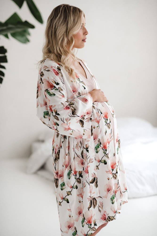 Szlafrok został zaprojektowany z myślą o mamach, dlatego jest nieco dłuższy, abyś spokojnie okryła nim ciążowy brzuszek. Po porodzie bez skrępowania b będziesz mogła spacerować po szpitalnym korytarzu lub na leżąco nakarmiła maluszka w połogu. Posiada kieszenie na niezbędne drobiazgi i pasek do regulowania szerokości.