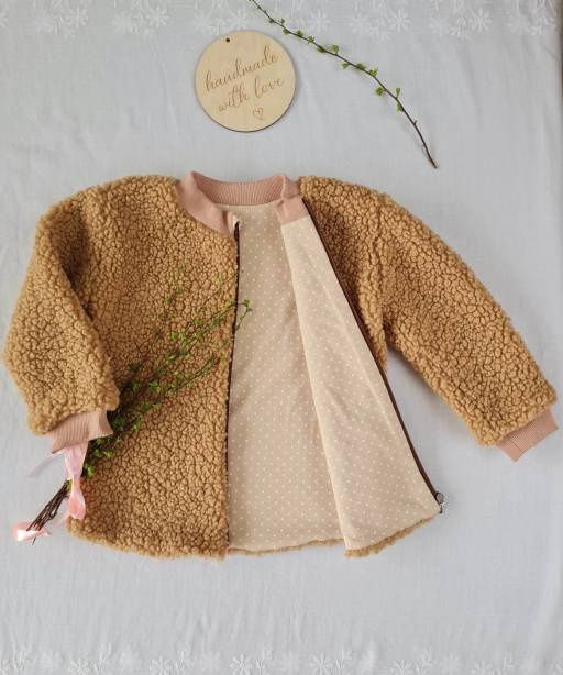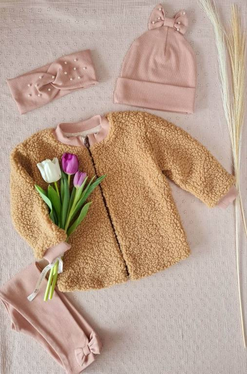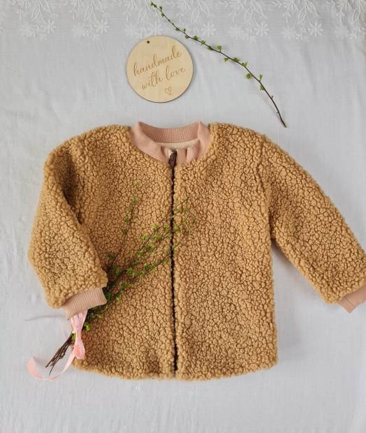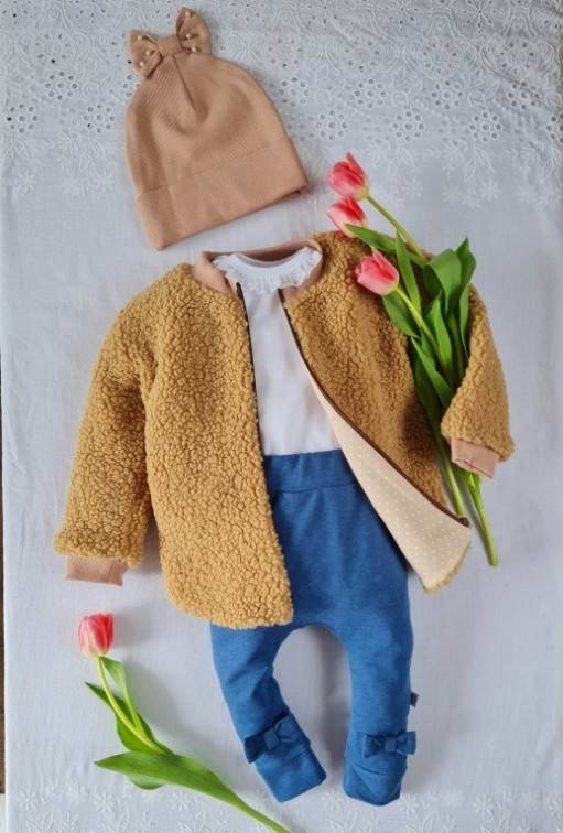 Płaszczyk wykonany z bawełny i baranka. Ubranko idealnie nadaje się na chłodne dni. Materiał jest całkowicie bezpieczny dla skóry dziecka