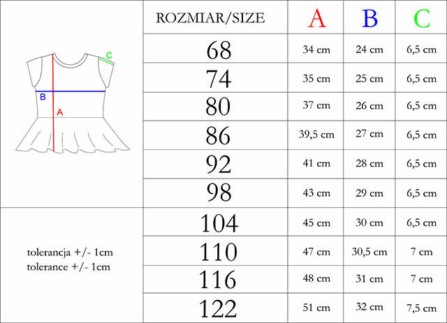 Wykonana ze 100% bawełny bluzka. Fason zdobi w dolnej części falbanka. W modelu na tyle zastosowano zapięcie typu łezka, zapinane na bezniklowego napa.
