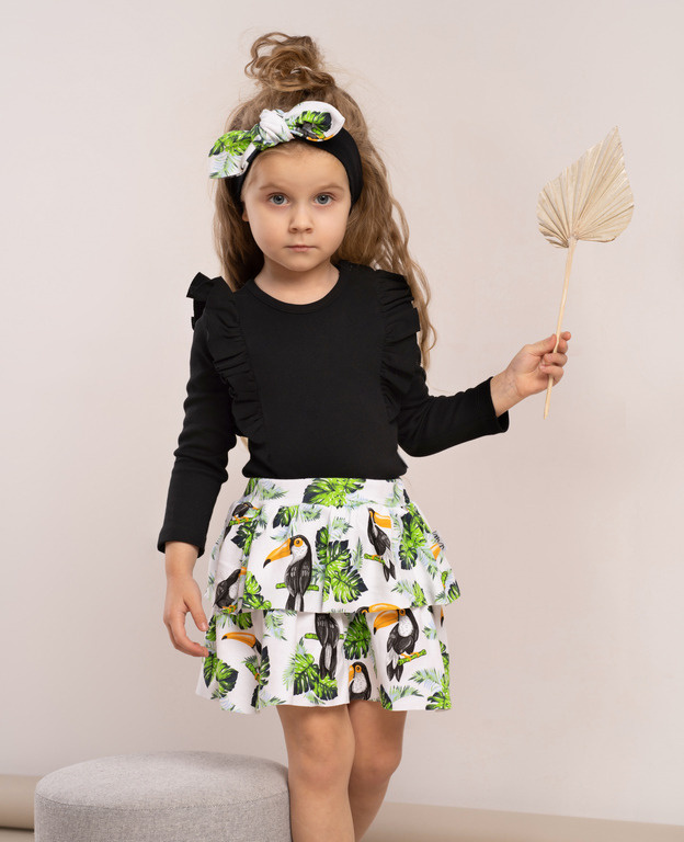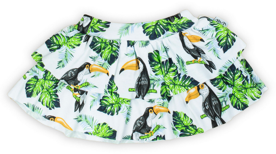 Wygodna,  spódniczka w tropikalne wzory. Ozdobiona falbanką.