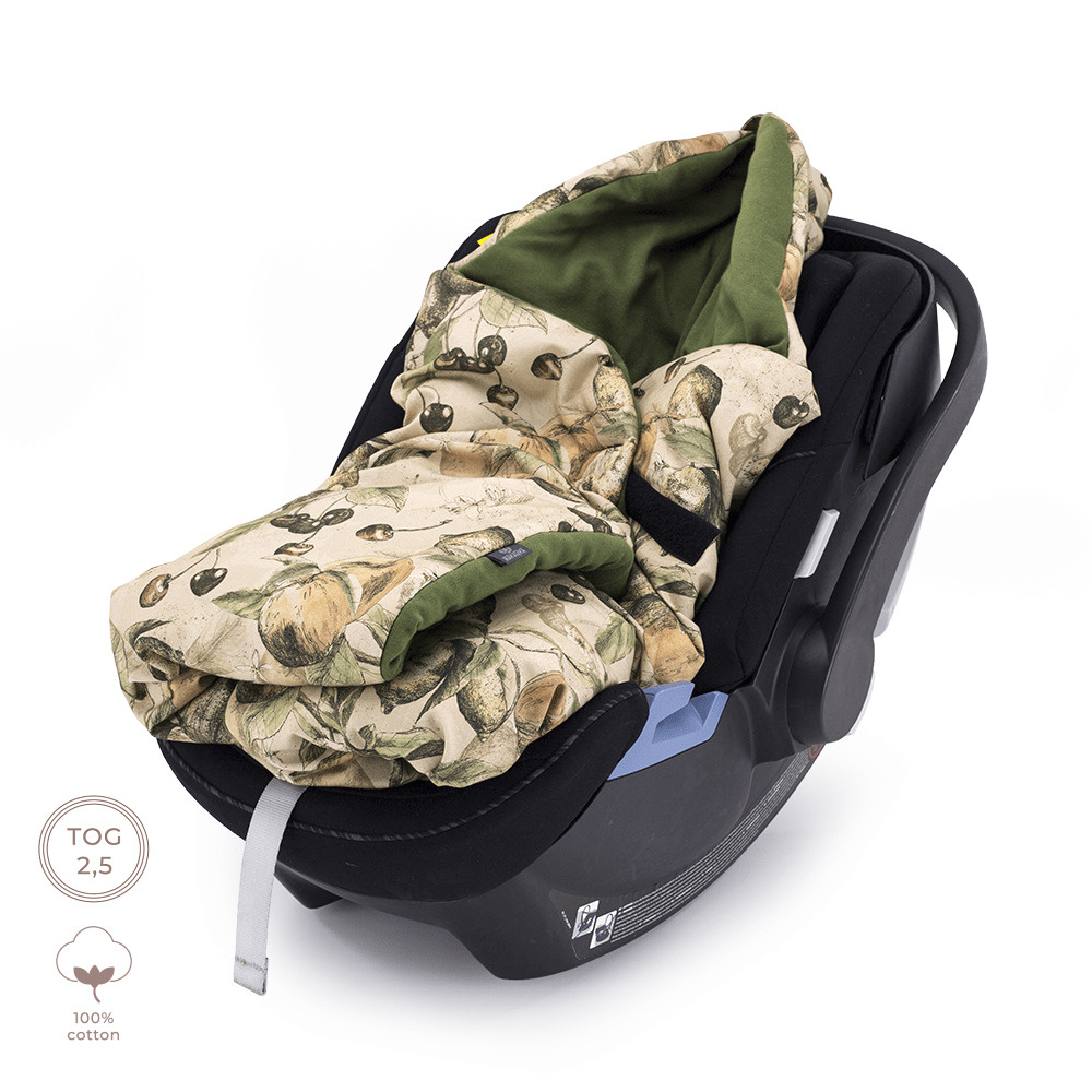 Otulacz do fotelika wyposażony jest w otwory na trzy i pięciopunktowe pasy bezpieczeństwa, zapinany jest na szeroki rzep z dużym obszarem regulacji, a w górnej części posiada zapinany kapturek, który otula i chroni główkę.