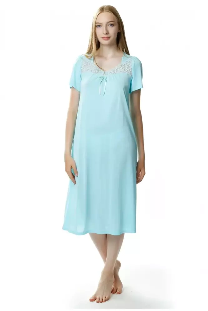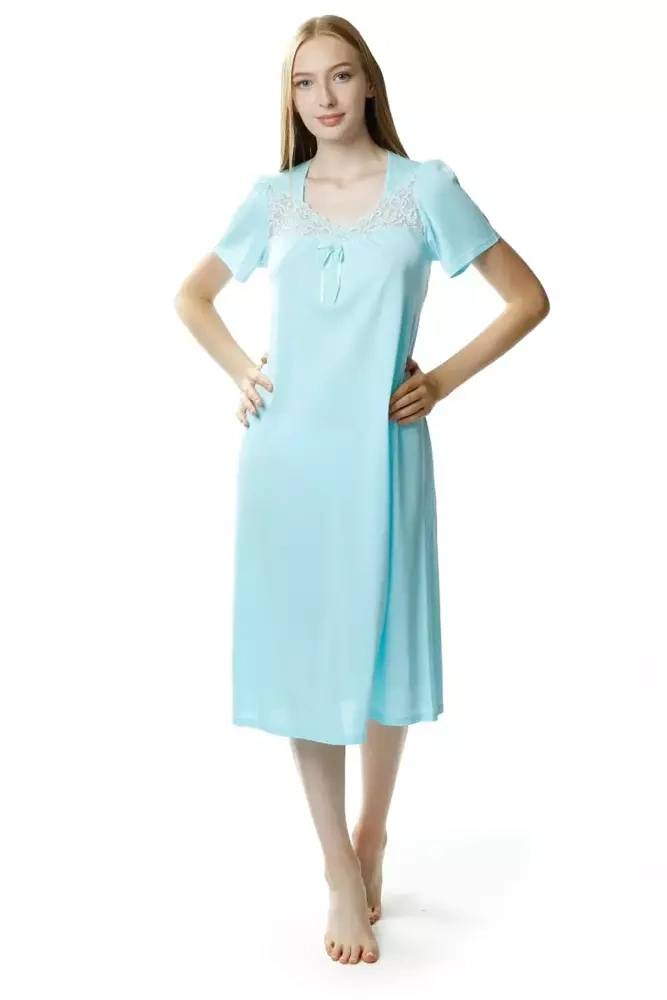 .Koszula nocna wykonana z dzianiny wiskozowej z krótkim rękawem o długości - za kolano. Elementem zdobniczym jest zastosowanie elastycznej, miękkiej koronki o motywie kwiatowym, która nadaje uroku i kobiecości. Całość dopełnia delikatna kokardka.