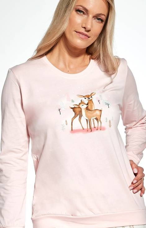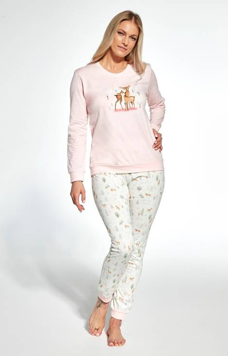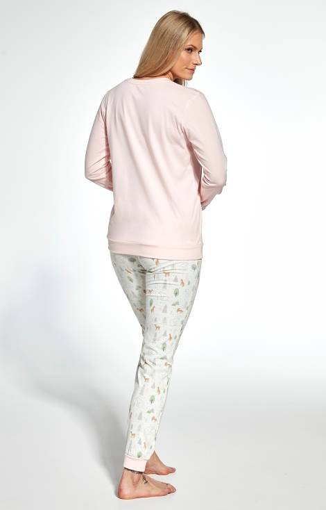 Piżama damska wykonana z wysokiej jakości bawełny. Koszulka z nadrukiem. Do kompletu długie wzorzyste spodnie.