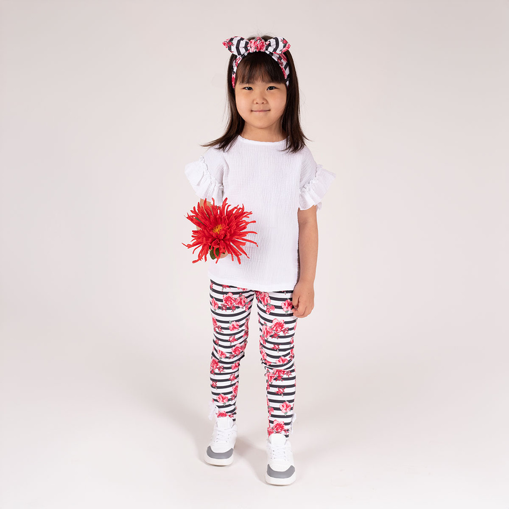 Dziewczęce, wzorzyste legginsy. Ściągacze w pasie i przy kostkach zapewniają odpowiednią przyczepność, nie wpływając na swobodę ruchów dziecka i jego komfort.