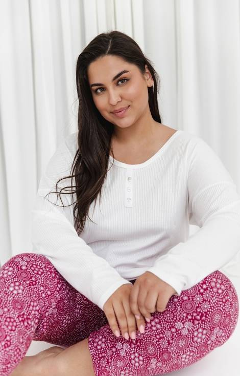 Bawełniana piżama damska. Koszulka jednolita w prążek z długim rękawem , dekolt okrągły ozdobiony guzikami . W komplecie wzorzyste spodnie 7/8.