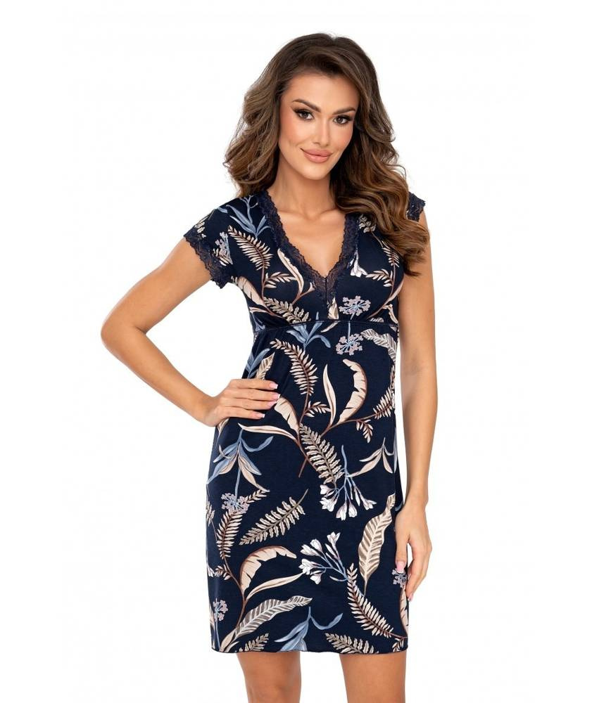 Model o klasycznym kroju. Dekolt w serek wykończony delikatną koronką. Rękawki luźne, nie krępujące ruchów. Pod biustem gumeczka. Tkanina delikatnie rozchodzi się w kierunku bioder. Piękną,granatową wiskozę zapełniają delikatne rośliny w przygaszonych barwach tworząc elegancką kompozycję.