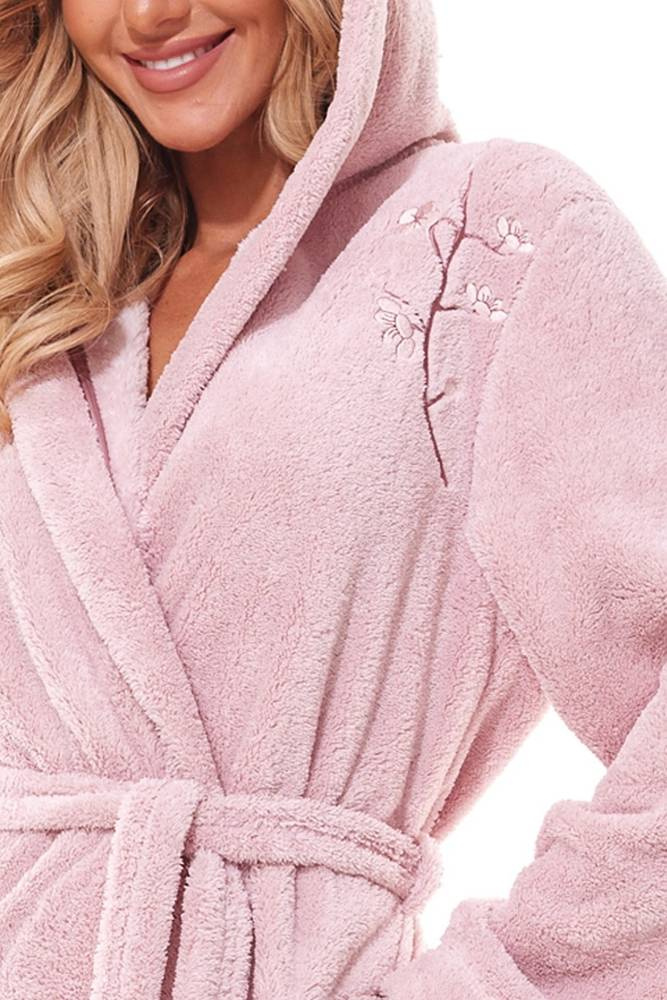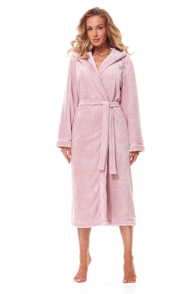 Długi szlafrok damski z kapturem ozdobiony delikatną aplikacją