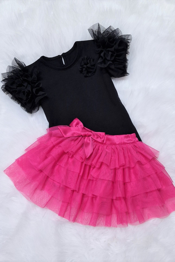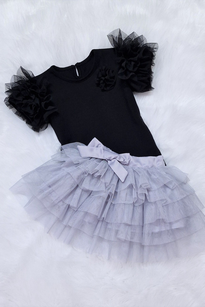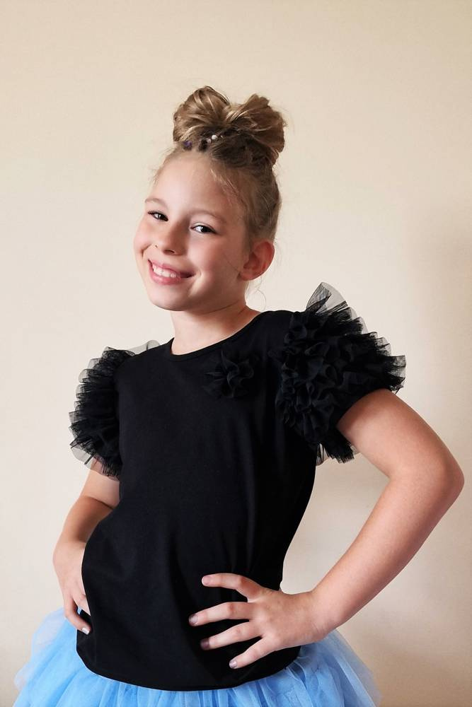 Bluzka dziecięca uszyta z miękkiej i przyjemnej w dotyku bawełny. Ozdobiona tiulowymi rękawkami. Stylizację uzupełnia spódniczka Inez. Modny krój, elegancja i niepowtarzalność!