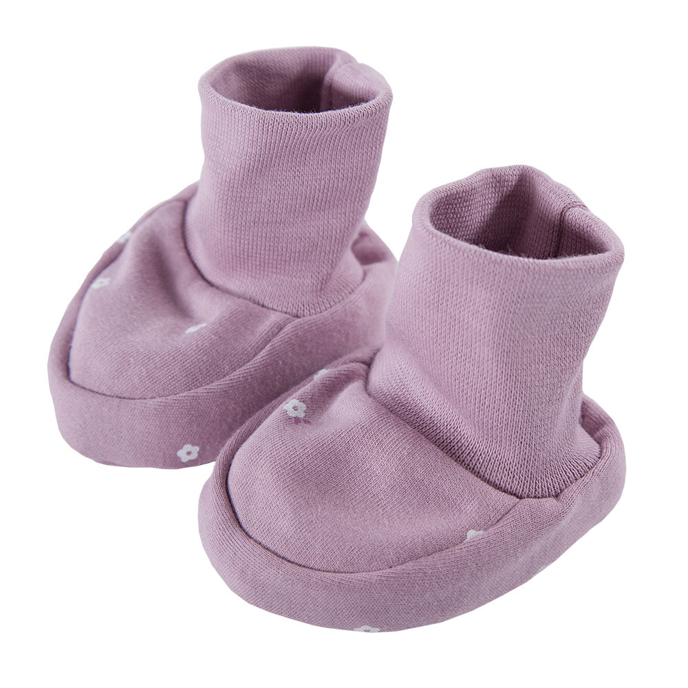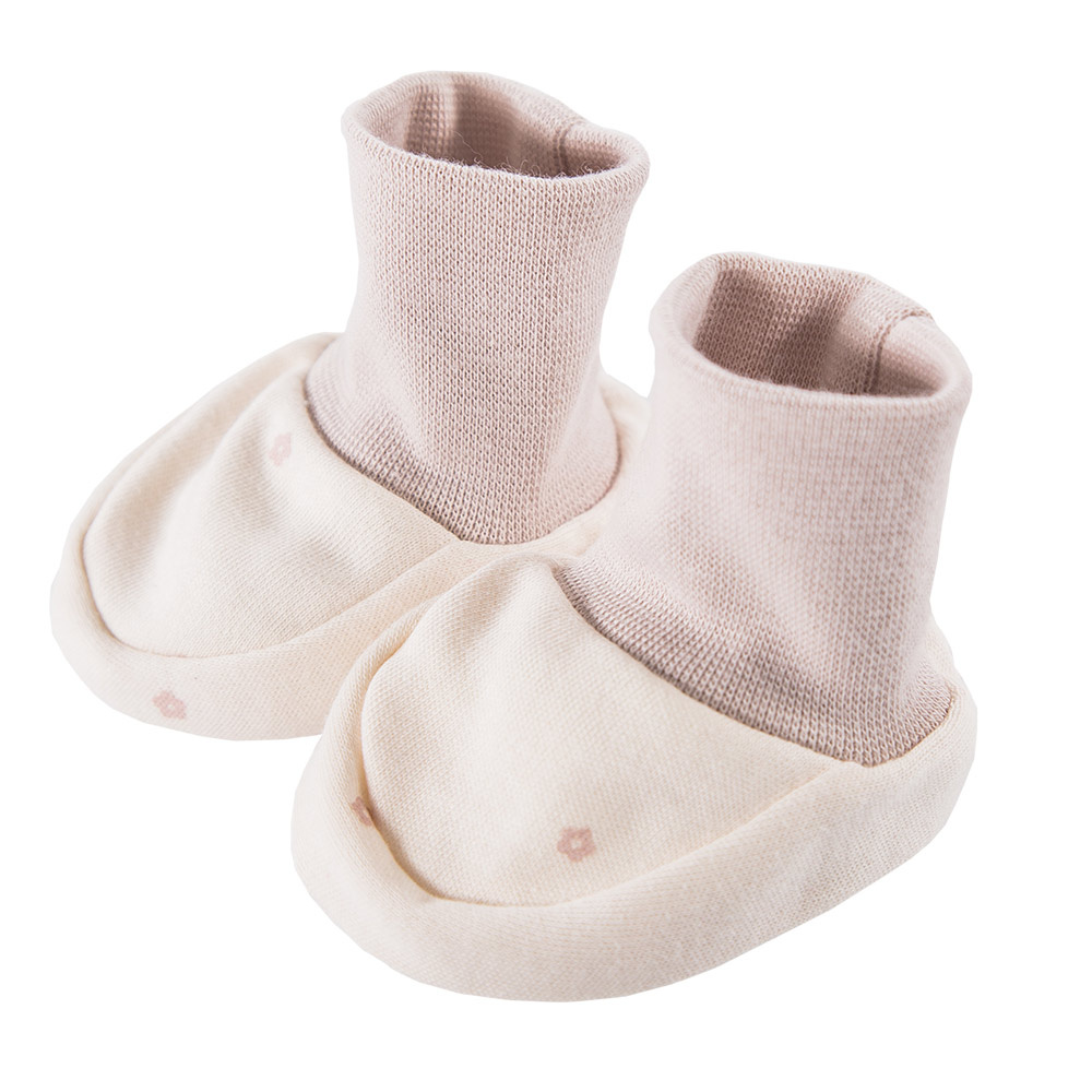 Wysokogatunkowe buciki niemowlęce z przyjemnej w dotyku i bezpiecznej dla skóry bawełny. Delikatny ściągacz zapobiega zsunięciu się bucików nie uciskając przy tym nóżek dziecka. To niezbędny element wyprawki niemowlęcej.