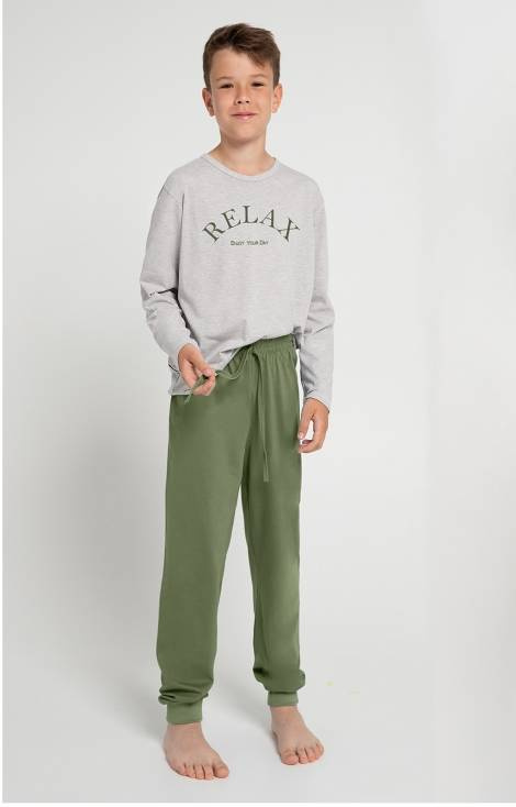 Koszulka z długim rękawem z przodu nadruk, dekolt okrągły. Spodnie długie, w kontrastującym kolorze.