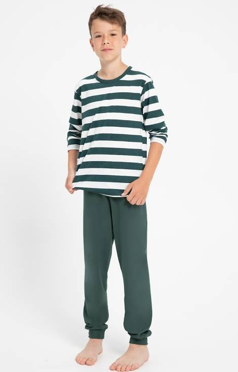 Koszulka z długim rękawem w paski, dekolt okrągły. Spodnie długie, gładkie.
