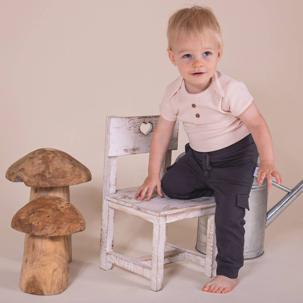 Body z krótkim rękawem, uszyte z bawełny gładkiej. Produkt jest zapinany na bezniklowe napy w kroku.